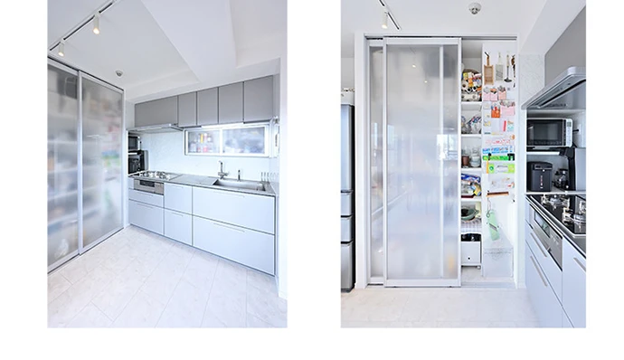 キッチンは、対面式から壁付けキッチンに変更。シンプルでコンパクトにまとめたので、使いやすく、お手入れも楽に。また、作業スペースが広がりとても動きやすくなりました。吊戸棚の一部とキッチン収納には、半透明の扉を採用したことで、閉塞感の少ない、明るい印象のキッチンとすることができました。奥さまのアイデアで、キッチン収納の一部は白いスチールボードとし、マグネットで調理道具などの小物を付けられるようにしました。