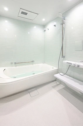 浴室は、洗面室を移動させたことで拡張が可能となり、1216から1620へサイズアップ。さらに、肩湯機能付きの浴槽に交換し、バスタイムをゆったりと楽しむことができるようになりました。床は、自動洗浄機能付きで、お手入れが楽になりました。