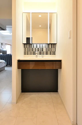洗面化粧台は、帰宅後すぐに手が洗えるように、玄関の近くに設置しました。手を洗ったあとは、ウォークスルークロゼットに入り、バッグを置いたり着替えたりしやすい動線としました。