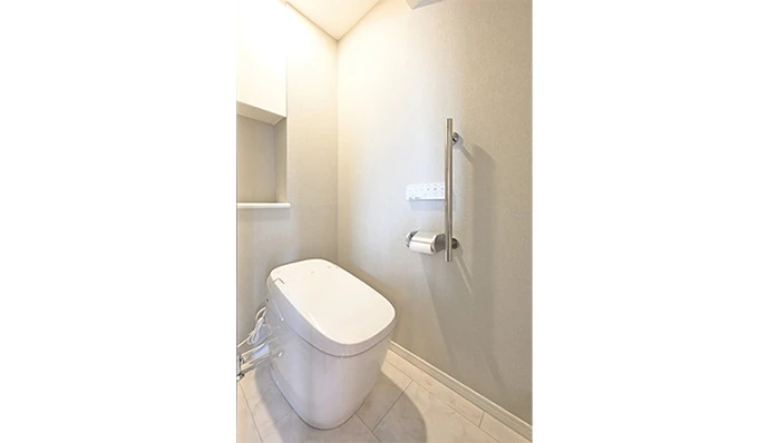 トイレは、掃除のしやすいタンクレスタイプを採用。洗面化粧台に近いので、トイレ内には手洗い器やカウンターをあえて置かず、シンプルでゆとりのある空間としました。