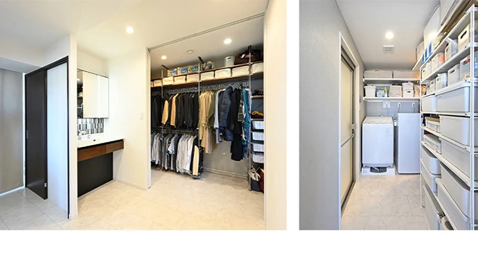 洗面スペースの隣に、すぐ入ることができるウォークスルークロゼットを新設。普段お使いになる衣類や季節物の衣類などの収納を集約しました。また、浴室近くに、洗濯機置き場と脱衣スペースを移したことで、帰宅後、ウォークスルークロゼットで着替え、脱いだ衣類は洗濯機へという動きが一つの動線となりました。