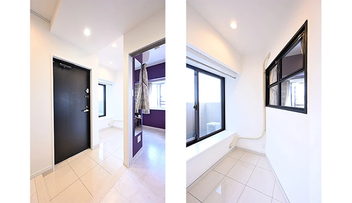 玄関脇には、物干しポールを取り付けた洗濯物が干せるスペースを新設。大きな窓と室内窓があるため、風通しがよく、洗濯物がよく乾きます。