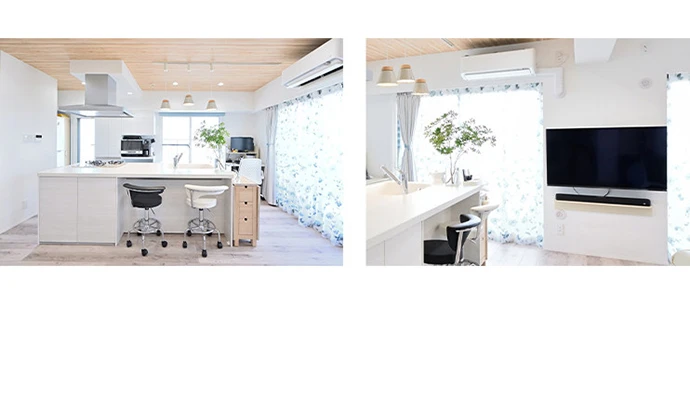 リビング・ダイニング、キッチンは明るさを大切に、白を基調として床と天井に明るい色の木目調を採用しました。ダイニングの隅には、奥さまのワークスペースを確保。リビング・ダイニングの床には、ご夫婦の憧れだった床暖房を新設しました。テレビは壁を補強して壁掛けにしました。アームで角度が変えられるため、テレビ鑑賞できる空間が広がりました。キッチンカウンターからは、お食事しながら窓越しにスカイツリーが一望でき、ご夫婦お気に入りの空間となりました。