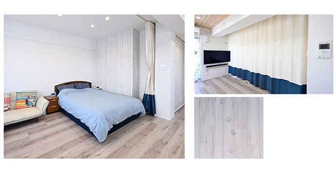 和室を洋室(2)に変更し、ご夫婦の寝室としました。ベッドサイドには、飼っていた愛犬を思い出させる足跡をモチーフとした壁紙を採用。遊び心あるデザインで、就寝・起床時も楽しい気持ちにさせてくれます。ベッドルームは、リビング・ダイニングと隣接しているためつながりを意識して、あえて建具を設けずカーテンを採用することで、より開放感が増しました。