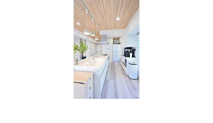 半個室だったキッチンは、開放感のあるアイランドキッチンに変更しました。広々としたキッチンをすっきりと使えるように、キッチン背面には食器棚を新設。収納する調理家電のサイズに合わせて造作しました。照明は、天井と合わせて、一部に木目を組み合わせたデザインを採用し、統一感を持たせています。使い勝手がよく、明るいキッチンとなりました。