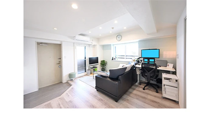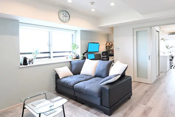 築25年のマンションにお住まいのHさま。壁を減らして可変的かつ風通しをよくしたい、キッチンを明るくしたいとのご要望を受け、まずは仕切りがほとんどない開放的な間取りをご提案しました。また、ご夫婦ともに在宅でお仕事をされるため、それぞれのワークスペースを設け、集中できる環境を整えました。お部屋に出ていたものは、なるべくウォークインクロゼットに納めて、より開放感を感じられるように、建具に引き戸やロールスクリーンなどを取り入れることで、すっきりと風通しのよい開放的な住まいとなりました。