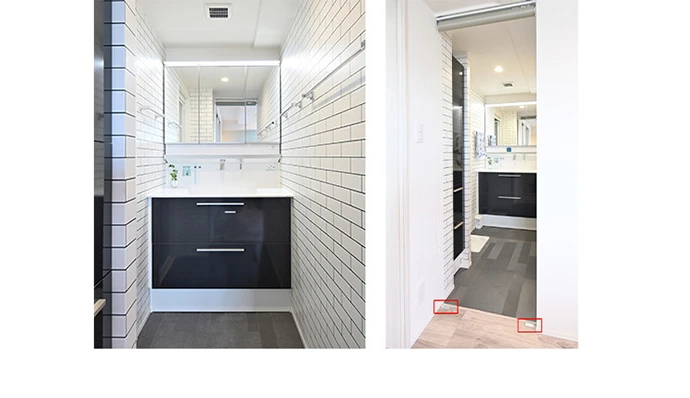 洗面室は、洗面台の面材に黒、壁は白のタイル柄を選び、ホテルを思わせるシックな空間に仕上げました。床は素足で歩くのが気持ちよいクッションフロアとしました。洗面化粧台は収納量のある三面鏡タイプを採用。仕切りとなるロールスクリーンはマグネットキャッチャーで床に固定できるため、風に煽られる心配もありません。