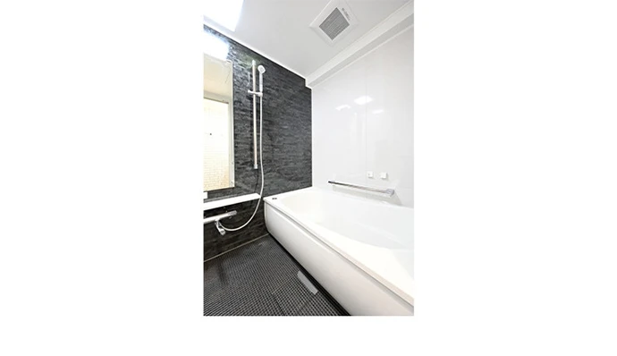 浴室は、浴槽に保温性能に優れたユニットバスを選びました。アクセントパネルは洗面室とつながりが感じられるブラックを採用し、ホテルのようなシックな雰囲気に仕上げました。