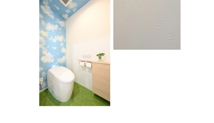 トイレは、お掃除の手間を軽減するため、きれい除菌水※1を搭載したタンクレスタイプを選びました。愛犬との散歩をイメージした、楽しさと爽やかさが感じられる芝生の柄のクッションフロアと、青空の柄の壁紙を採用しました。