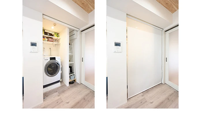 これまで洗面室に置いていた洗濯機は、新たに専用のスペースを設けました。キッチン、ベッドルームとの距離も近くなり、より効率的に家事ができるようになりました。収納にはロボット掃除機の充電スペースも確保。間仕切りには、全開時もコンパクトで場所を取らないロールスクリーンを採用しました。