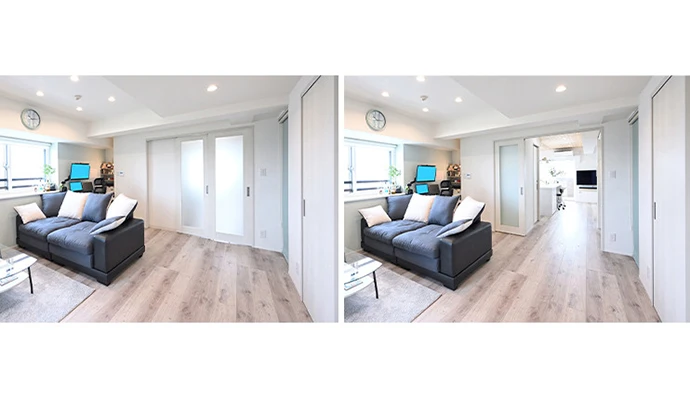 洋室(1)とリビング・ダイニング、キッチンをつなぐ扉は、全開できる建具をご提案しました。開放時はお部屋全体が一望できて、風通しがよくなりました。上吊り引き戸のため、床にレールがなく、バリアフリーにも対応しています。