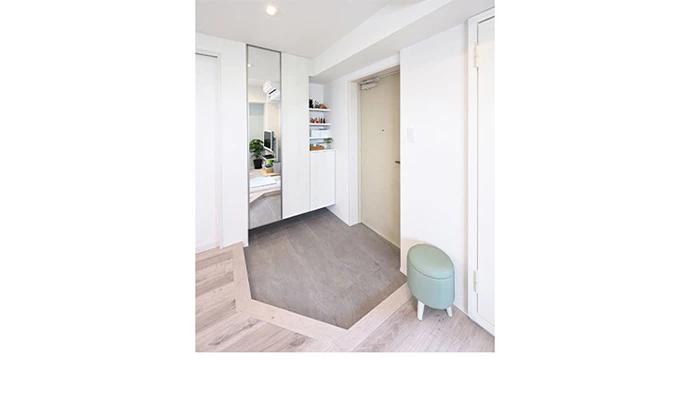 玄関は収納の位置を変えて、スペースを広げるご提案をしました。たたきも広くなり、収納の扉に大きな鏡をつけたことで、お出かけ前の身だしなみチェックがしやすくなりました。また床材には耐久性に優れた硬質タイルを選びました。