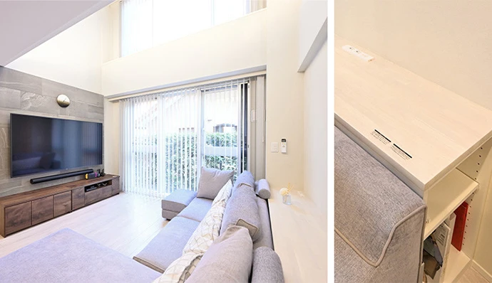 リビング・ダイニングの床や壁はホワイトとグレーを基調とすることでとても明るい空間となりました。テレビを掛ける壁はエコカラット※1を採用。また配線を壁の中に入れてすっきりとさせました。ソファの背面には、USBポートやコンセントが設置されたカウンター収納を新設。また、吹き抜け窓から日差しがたっぷりと入ります。