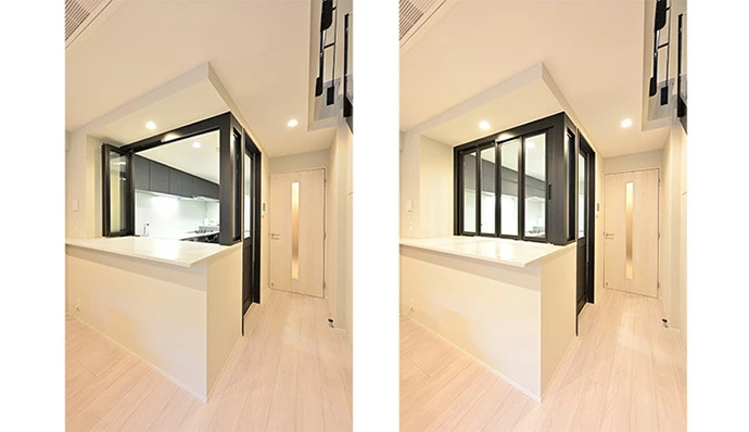 キッチンをコの字型から壁付けキッチンに変えることで、作業スペースが広がり、お料理がより楽めるようになりました。また、ダイニング側には料理の匂い移りを防ぐために、ガラス素材の建具を新たに設置しました。開閉可能なこの建具は、お料理を出す際にも便利に使用できます。サッシにはモノトーンを意識してブラックを採用し、お部屋全体のインテリアの統一感を持たせました。ガラス素材にしたことで、閉じた状態でもリビング・ダイニングまで見通すことができます。