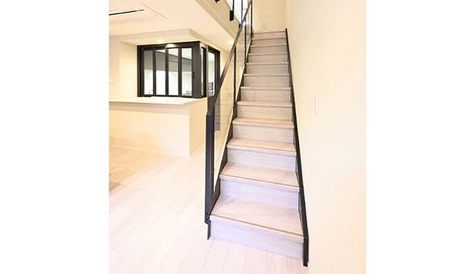 2階へと続く階段には、安全のための手すり壁を新たに設置しました。手すりはモノトーンのブラックを採用し、手すり壁はガラス素材を採用して、キッチンの建具と調和させました。さらに、ステップ部分の材料をリビング・ダイニングの床材と同じホワイトの色調に統一することで、お部屋全体のインテリアを統一しました。