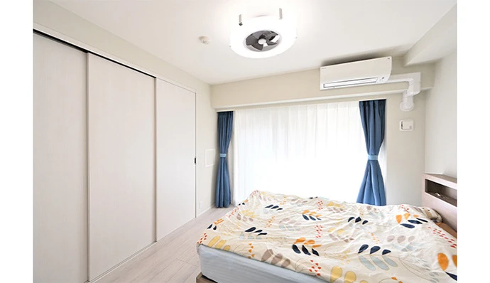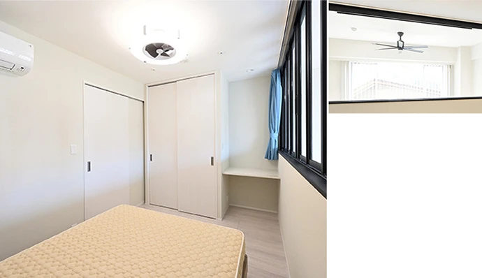 ご両親や親戚が訪れた際のゲストルームとして使用する洋室(2)は、引き違い窓と左右の壁面を取り払い、全開放が可能なガラスの折れ戸に変更することで明るく開放的になりました。またスーツケースなど大型のものが入る収納と、デスクも設けました。吹き抜けの天井にはお部屋の空気を循環させるシーリングファンを設置しました。