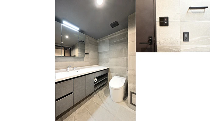 洗面室は、壁一面を洗面化粧台と収納スペースにしたことで、広々とスッキリとした空間となりました。洗面室は、Vさまのお好みであるブラックを基調にしながらも、重苦しい印象を避けるためにグレーを取り入れ、バランスの取れた空間になりました。トイレは、コンパクトなタンクレスタイプを採用し、ホテルライクな空間を実現しました。