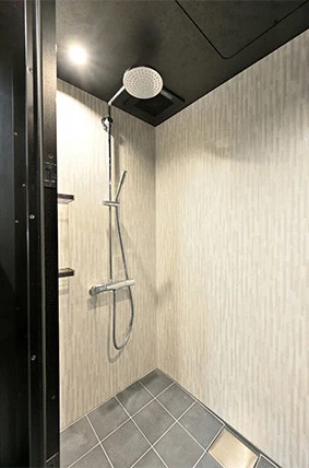 浴槽を使用されないことが多いとのことから、浴室はシャワーブースへと変更しました。オーバーヘッドシャワーを設置し、より快適な入浴環境を実現しました。床にはグレーのタイル、天井にはブラックの素材を用いることで、洗面室と合わせたシックなカラーコーディネートとしました。