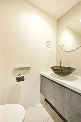 1階のトイレは、ホワイトを基調にしながら、収納の建具、洗面ボウルにはアクセントカラーとなるシルバーやグレーの色調を取り入れました。また優しい印象となるようにタオル掛けなどのアイテムは全て丸いフォルムで統一しました。ボウルはガラス素材を用いて、ラグジュアリーな雰囲気を演出しました。