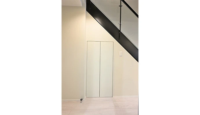 元々、階段の下に収納スペースがなく、物を置くと散らかって見えることを懸念されていました。そこで、新たに壁を設置して収納スペースを確保しました。この収納は、取手のないプッシュオープン扉を採用し、スッキリとした外観となりました。