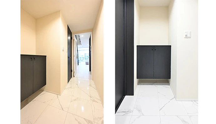 玄関収納は、モノトーンを意識したブラックのカラーで建具と統一。掃除がしやすいようにフロートタイプを採用しました。廊下には、高級感が漂うビアンコカララ調のタイル材を採用しました。