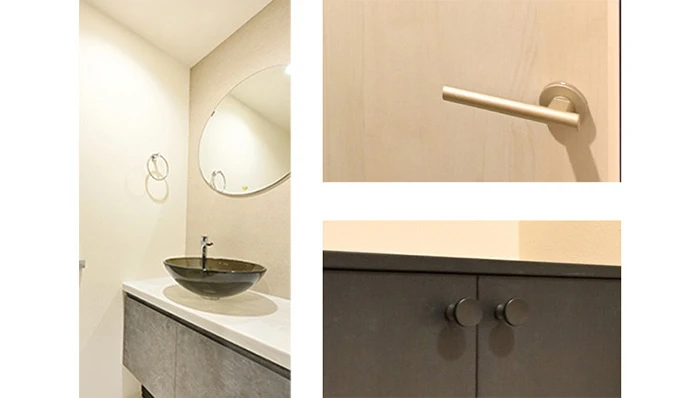 玄関スペースの収納の取手やウォークインクロゼット、そして廊下のドアノブなどは、すべて丸みのあるデザインで統一しました。さらに、1階トイレの鏡やボウルなども同様に丸いフォルムを持つアイテムで統一され、調和のとれた美しい雰囲気が生まれました。