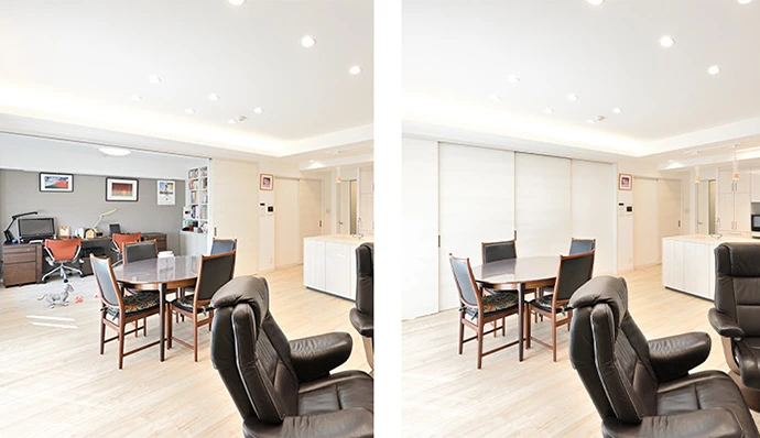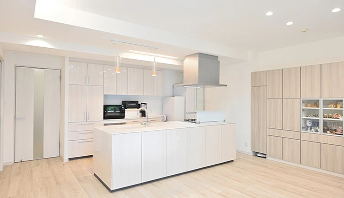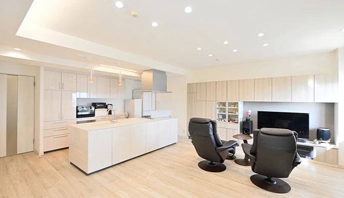 すでにお子さまが独立され、今後、ご主人が定年退職を迎えることから、これからの生活を見据えて、夫婦2人暮らしに適したプランを検討いたしました。「これまでのような部屋数は不要」とのことでしたので、4LDKだった間取りを2LDK+WTC(ウォークスルークロゼット)に変更。ゆとりのある空間を生かして、動線がスムーズなアイランドキッチンや、お出かけ前後の着替えに便利なウォークスルークロゼットなどの収納をご提案し、とても喜んでいただけました。また、白を基調とした淡いトーンでインテリアカラーをまとめることで、お手持ちの家具が映え、上品でエレガントな空間に仕上がったと思います。