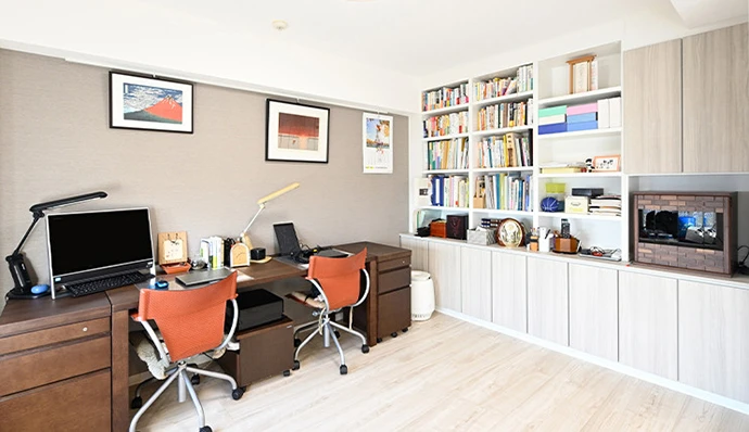 洋室(2)には、ご主人と奥さまが並んで座れるように机と椅子をレイアウト。シンプルな空間にグレーの壁紙や家具のカラーがなじみ、色彩的にも心地よさを感じられるスペースになりました。