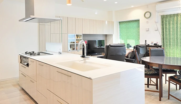 22年ほど前に、新築で現在のお住まいであるマンションを購入されたKさま。時が経ち、壁紙の劣化などが気になっていたことから、リフォームを検討されていました。約1年前に浴室とトイレをリフォームし新しい設備の使いやすさを実感していたので、今回のリフォームでは、より快適に暮らせるようにその他の部分を一新することに。また「明るく開放的な空間にしたい」というご要望を受け、リビング・ダイニングを広げ、動線がスムーズなアイランドキッチンを導入することでストレスなく動き回れる広々とした空間をご提案しました。また、大容量のウォークスルークロゼットや各所に収納スペースを設けることで、使いやすい場所に衣類や日用品を片付けられるようになり、すっきりと美しく暮らせる住まいを実現しています。