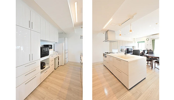 キッチン収納は、ゴミ箱や家電などの持ち物に合わせて設計。冷蔵庫の隣には、まとめ買いをした際に便利なフリーザー(冷凍庫)をおけるスペースを設置しました。壁に囲まれた独立型キッチンからアイランドキッチンに変更することで、窓からの光を浴びながら気分よくお料理ができるようになりました。