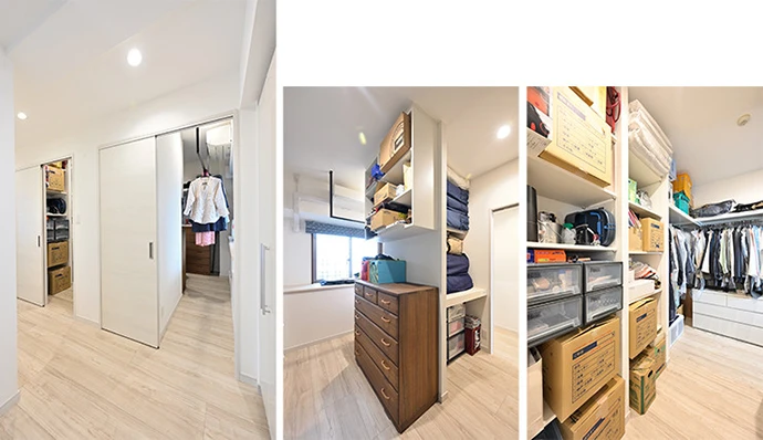 すでにお子さまが独立され、使用していなかった子ども部屋をウォークスルークロゼットに変更し、衣類を中心に収納しています。出入り口が2カ所あり、通路のように通り抜けながら使用できるので、お出かけ前後の動線上でスムーズに着替えることができるようになりました。もともとお持ちだったタンスや、お子さまやお孫さんが泊まりに来た時のための布団セットを収納するスペースもしっかりと確保しています。