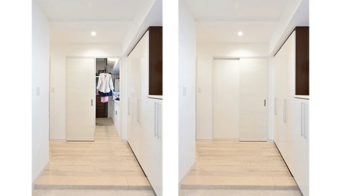 玄関から見たウォークスルークロゼット。玄関前にあるので外出前後にアクセスしやすい点も、使いやすさにつながっています。扉を閉めれば、白い壁と一体化し存在を感じさせません。