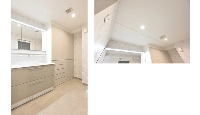 洗面室はスペースを拡張し、リネンや下着などを収納できる大容量の収納を設けました。リビング・ダイニングから廊下に出ることなくアクセスができるので、家事の効率が上がり、特に奥さまに喜ばれています。使用するときだけ引き出して使えるワイヤー式の物干しは、室内干しや乾いた洗濯物の一時がけなどの際に重宝します。