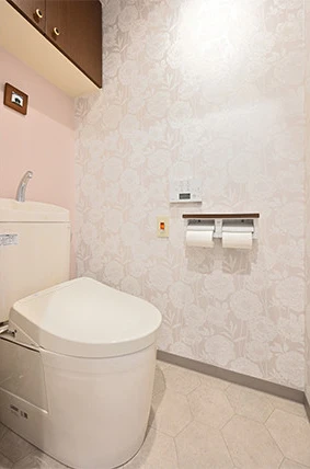 1年前にリフォーム済だったトイレも、床と壁紙を新調。洗面室とデザインを合わせることで繋がりを持たせました。