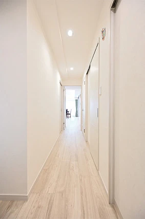 壁の色と扉の色と白で統一したため、部屋の扉をすべて閉めると、リビングの窓から入る光が際立つ廊下。奥行きと広がりを感じられる、心地のよい空間となりました。
