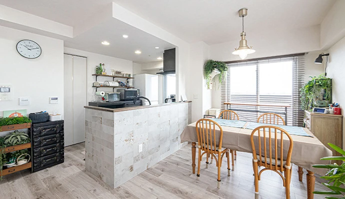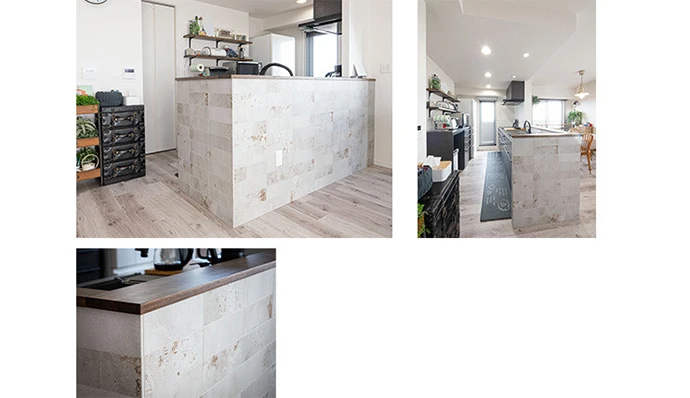 キッチンの腰壁には、お部屋の雰囲気に合うように、錆のような質感を持つ薄いグレーのタイルを採用しました。また、壁面に新たに飾り棚を設置しました。これにより、お好きなものをディスプレイして楽しんでいただけるようになりました。