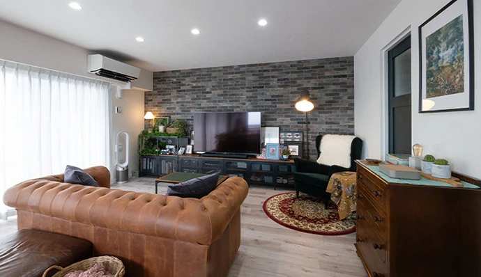 リビングの壁には、お手持ちのソファや収納家具に調和するレンガ調のタイルを使用しました。焼きムラや色あせ、デコボコした粗い質感がヴィンテージ感を醸し出しています。