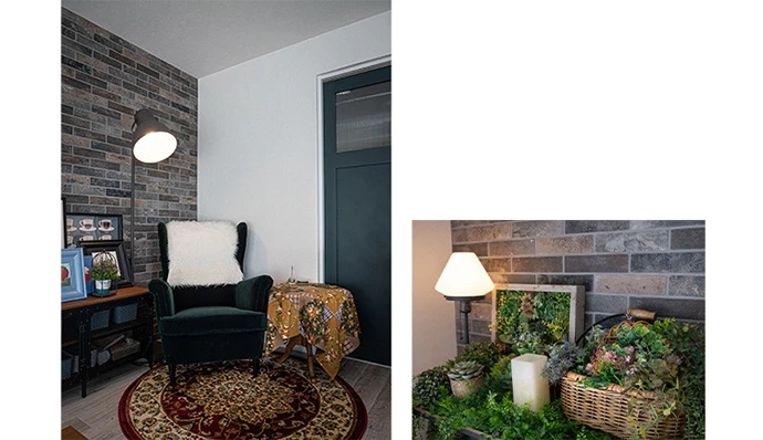 リビングのコーナーには一人用のソファが配置され、くつろぎのスペースが作られています。また、壁面のタイルがこだわりのディスプレイを引き立て、お部屋全体が魅力的な空間になりました。