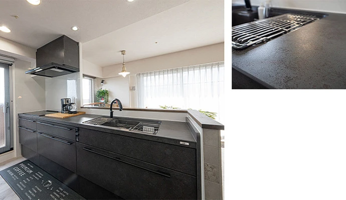 キッチンは素材感と色にこだわり、ブラック系のセラミックトップのキッチンを採用しました。デザインだけではなく熱や汚れ、キズにも強い素材が魅力的です。