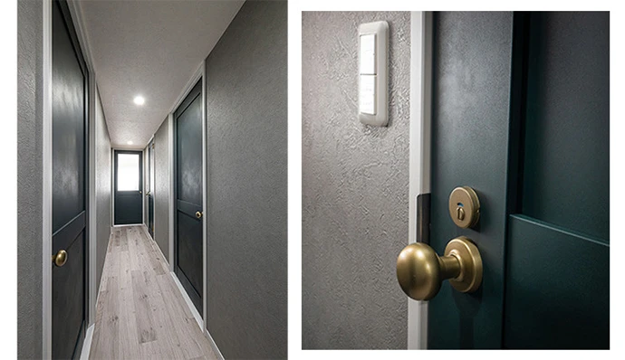 廊下のクロスはグレーを基調とし、扉には濃い緑色、取っ手には真鍮のような握り玉を使用することで、ヴィンテージ感あふれる空間を演出しています。