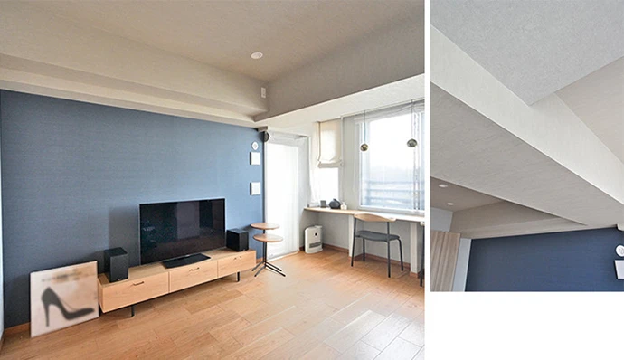 広々とした印象のリビングスペース。窓際にカウンターテーブルを造作し、ゆとりのある空間にしました。床材にはチェリーの突板フローリングを採用し、温かみのある優しい雰囲気に。壁面は薄いグレーのクロス、天井や梁には主にベージュのクロス、部分的にブルーのアクセントクロスと、3色のクロスを使い分けることで、リズム感のある印象的な空間に仕上げました。
