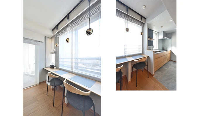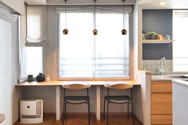 ダイニングテーブルを置かない代わりに造作したのは、カフェのような雰囲気のカウンターテーブル。窓からの景色を眺めながら、食事やお茶を楽しめます。シンプルな空間にゴールドのペンダントライトが映えて、洗練された印象になりました。キッチンの隣にあるので、配膳や片付けもスムーズに行うことができます。