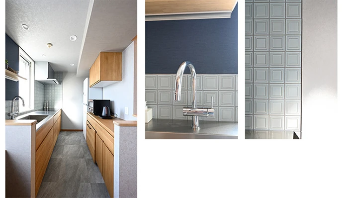 キッチンは、壁付けのI型キッチンに変更。「本物の木材を使用したキッチンにしたい」というご要望を受け、扉材に無垢の木材を使用していることが特徴のシステムキッチンをご提案しました。ドイツ製のキッチン水栓や、壁面のタイルにもこだわって、海外テイストのおしゃれなキッチンになりました。