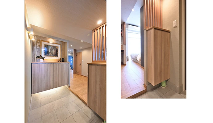 玄関に入ると、広々としたオープンスペースになっています。窓から入った光が届くため、家に入った時に明るさを感じ、ホッとした気持ちにさせてくれます。部屋の中が丸見えにならないように設置したルーバーの仕切りのおかげで、採光や通風を確保しながらも、ほどよい目隠し効果を得られるようになりました。