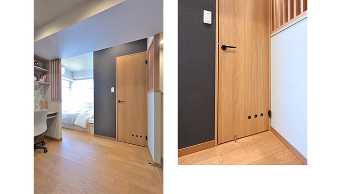 「収納はできるだけまとめたい」というご要望を受け、ベッドスペースの隣にウォークインクロゼットを設けました。衣類のほか、掃除機などを収納しています。ドアには照明の消し忘れ防止の丸窓が3つ並び、見た目にも楽しいアクセントになりました。