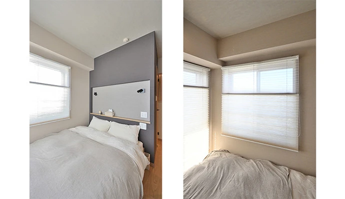 ベッドスペースも、リビングスペースなどの他のスペースとひと続きになっています。窓際の淡いピンクのクロスとベッドの背面のグレーのクロスの2色を使って、安らぎの空間を演出しました。ベッドの背面には、ちょっとした小物を置くことのできるニッチを造作。壁にはブラケットライトを取り付けました。
