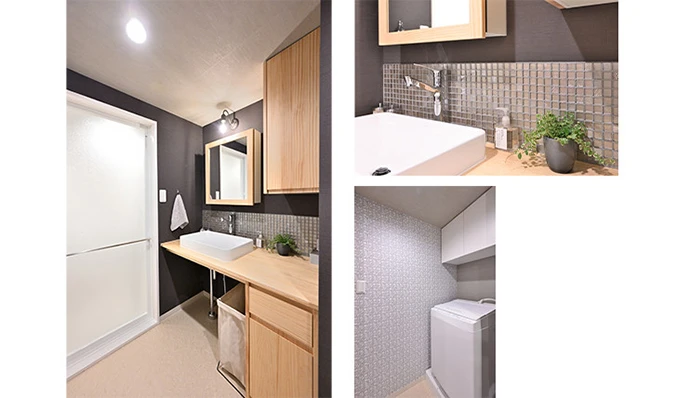 洗面室では、木目の美しい洗面化粧台を採用。インテリアのアクセントに、光の反射が美しいモザイクタイルを張りました。鏡の裏は収納になっていて、歯ブラシなどをしまうことが可能です。洗濯機の横には、植物柄のクロスを張ってその他の壁とは変化をつけました。
