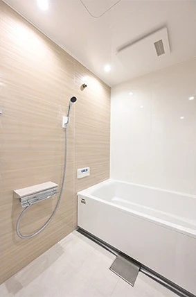 浴室は、本物の磁器タイルを使用した床材にこだわったユニットバスを採用。掃除がしやすいように、壁にはあえて鏡や収納棚などを設けていません。