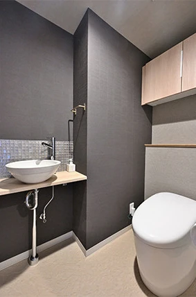 トイレには丸みのあるフォルムが特徴のタンクレスタイプを採用。チャコールグレーのクロスでスタイリッシュにまとめました。