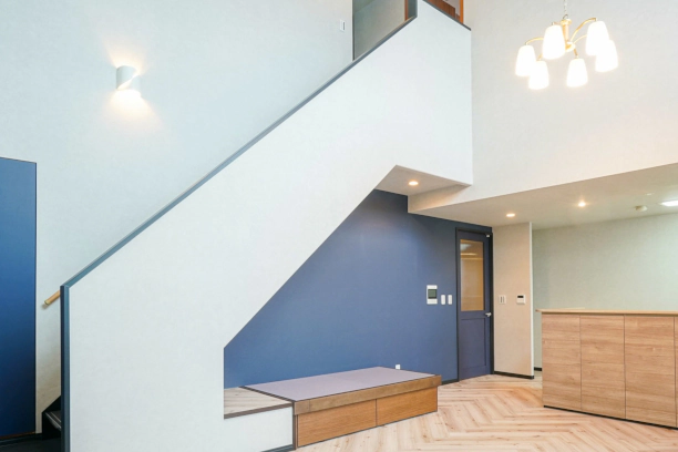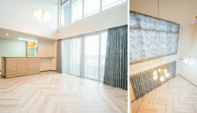 リビング・ダイニングは空間を広く感じられるように、吹き抜けの壁に床のヘリンボーン張りと同じデザインのアクセントクロスを採用しました。また、カーテンの色も壁や建具に採用したブルーのアクセントカラーに合わせて統一感を出しました。以前はキッチンカウンターの上に物が散らかりやすかったため、カウンター下に収納を設けることですっきりと片付いた場所に生まれ変わりました。